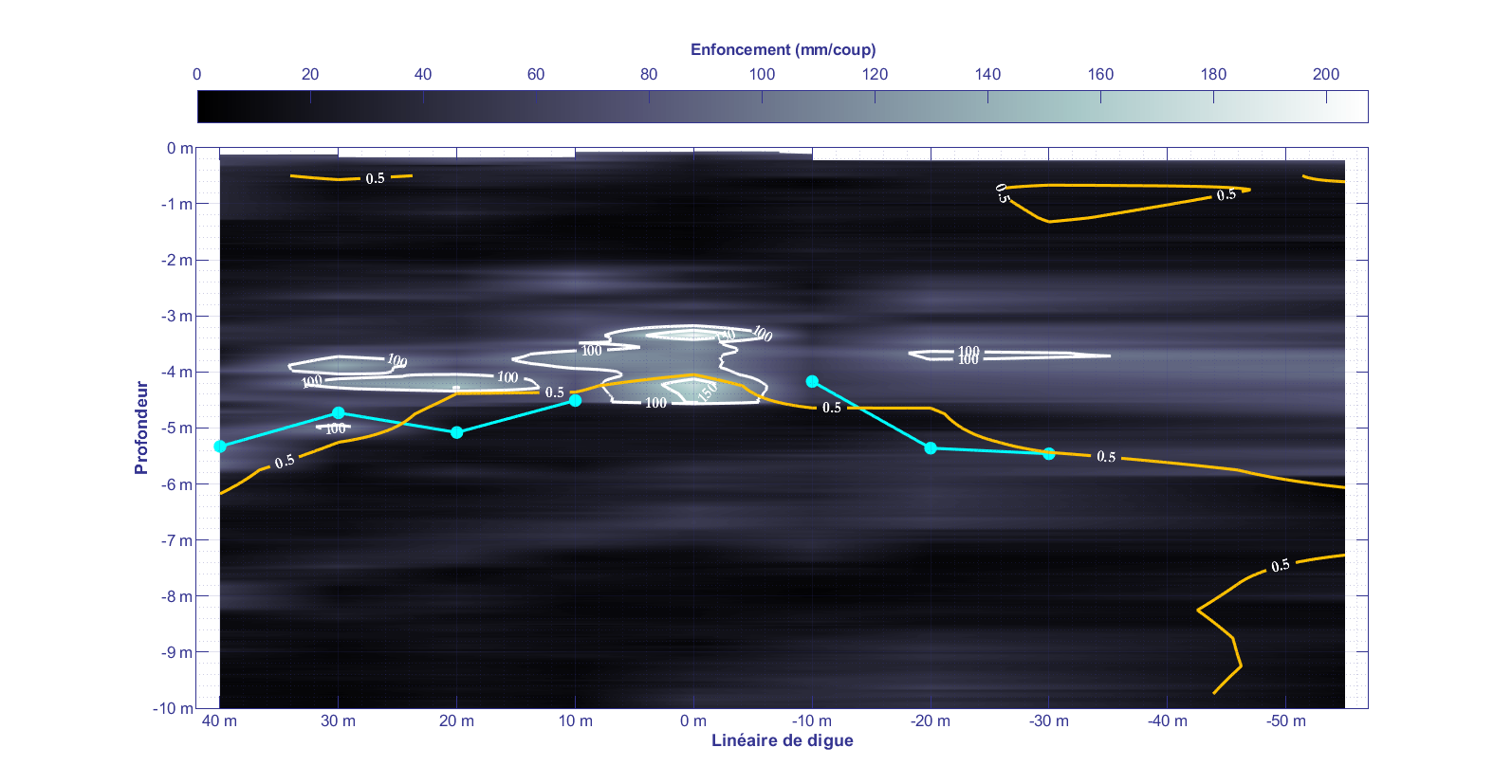 Courbes de niveau oranges = écart à la température attendue en l'absence d'écoulement Dégradé de noir = résistance à l'enfoncement des tiges mesurée lors du battage des tiges pénétrométriques Ligne bleue = niveau d'eau