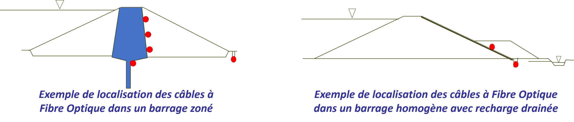 Les fibres de ces « systèmes d'auscultation par fibre optique » peuvent être enterrées dans des ouvrages ou collées à leur surface. Elles peuvent donc servir par exemple à mesurer la température, la déformation et le bruit acoustique ou sismique présent sur a priori tout type d'ouvrage (digues, barrages, tunnels, ponts, routes, pipelines, pylônes haute tension, bâtiments etc.).