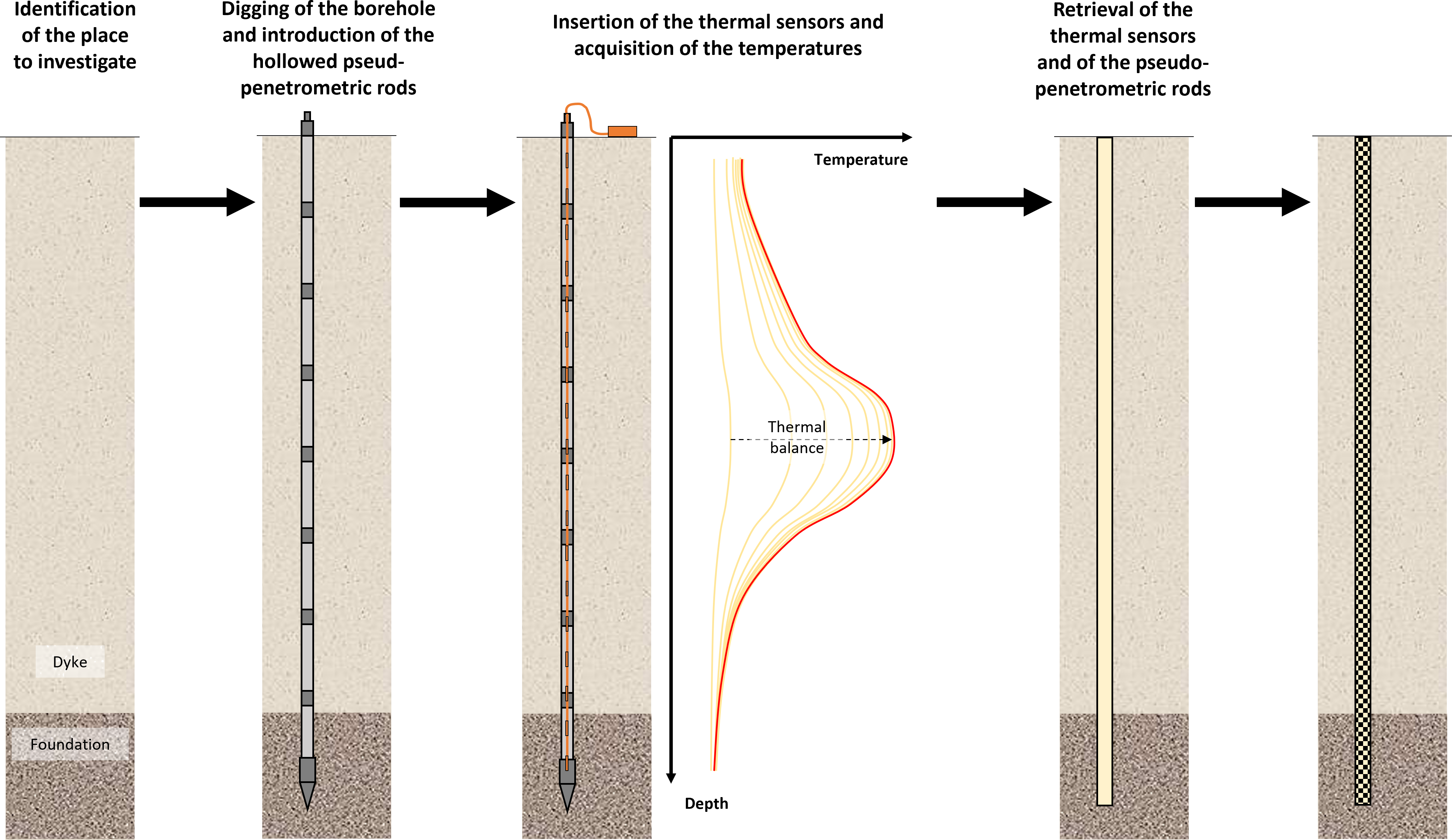 To carry out multiparameter mapping (temperature, mechanical resistance, etc.), geophyConsult mobilizes, if needed in an emergency, in the area affected by the leaks, one or more small driving drills and uses it or them to successively insert, down to the foundation (and, if possible, a little deeper), hollow penetrometer rods into which the operator inserts, as soon as the driving is complete, a chain of thermistors allowing him or her to obtain, once thermal equilibrium is reached, a vertical thermal profile and a vertical penetration resistance profile in the area affected by the disturbance.