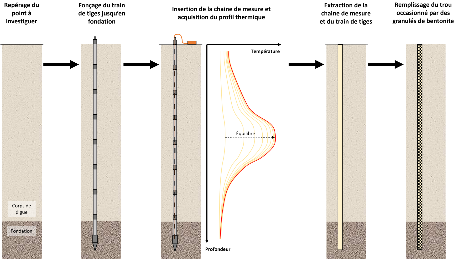 Pour réaliser une cartographie multiparamètre, geophyConsult mobilise, si besoin en urgence, dans la zone affectée par les désordres, une ou plusieurs petites foreuses à battage et l'utilise ou les utilise pour insérer successivement, jusqu’en fondation (et, si possible, un peu plus profondément), des tiges pénétrométriques creuses dans lesquelles l'opérateur insert, dès la fin du fonçage, une chaine de thermistances lui permettant d’obtenir, une fois l'équilibre thermique atteint, un profil thermique et un profil de résistance à l'enfoncement verticaux dans la zone affectée par le désordre.